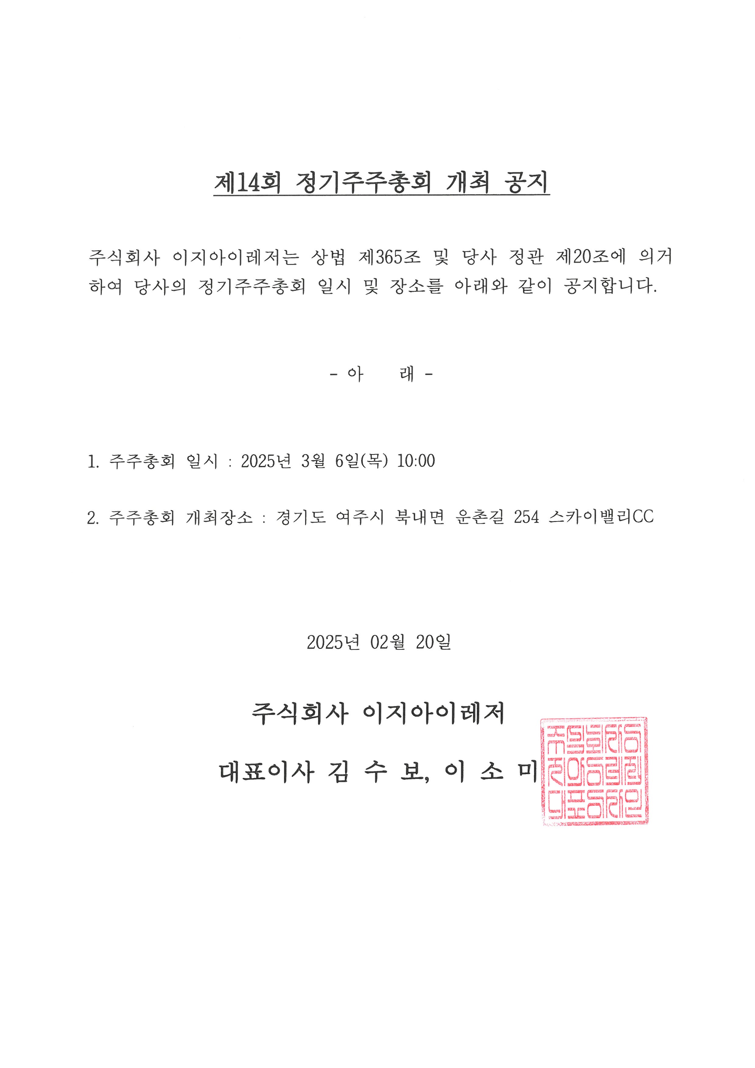 제목제 14회 (주)이지아이레저 정기주주총회 개최 공지 2025-02-20
